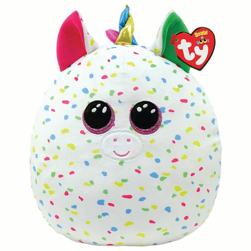 TyOnly 3 left!TY Squish a Boo is a soft plush animal in the form of a pillow. This unicorn has white fur with brightly colored dots. This unicorn is 20 centimet...