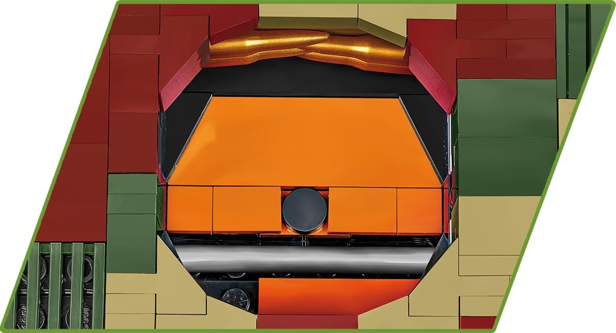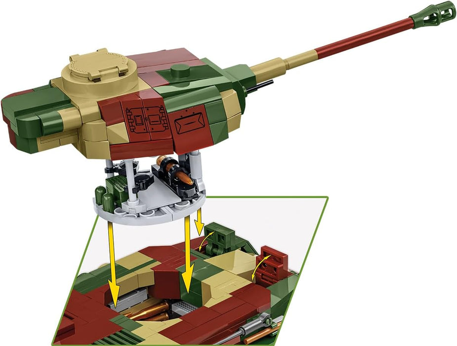 The Panzerkampfwagen IV tank was one of the most important German tanks during World War II. The block Panzer IV consists of 1,107 elements and is designed in a scale of 1:28. The blocks contain high-quality prints that do not wear off during play. The colorful camouflage is characteristic of the final period of the war. The model has an opening hatch in which a tanker figure can be placed. The turret rotates 360 degrees and the gun barrel can move up/down. The turret and basket can be detached from the set and you can admire the interior of the vehicle. There is a brick engine under the service hatch which can also be displayed next to the model. The tracks even work when you roll the tank around. The set includes a figure of a tank driver wearing a cap and headphones and a plate with the name of the vehicle printed on it.