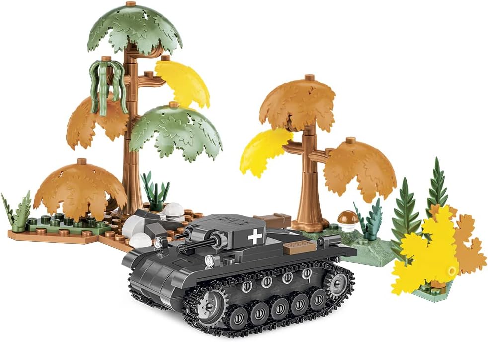 A miniature vehicle made of COBI construction blocks was produced in the completely new 1:48 scale. The tank comes with elements of the environment in the form of block vegetation, so sought after by fans of blocks! The set is easy to build, so it’s perfect for the beginning of the adventure with Polish COBI construction blocks. It has a movable cannon, a rotating turret and working caterpillar traction. All graphic details are high-quality prints that do not wear off even during intense use. One of the advantages of the set is a design that uniquely reflects the original shapes of its historical inspiration. The Panzer II tank model will be perfect as a toy, but also a unique element of any collection of a fan of military and armored weapons.