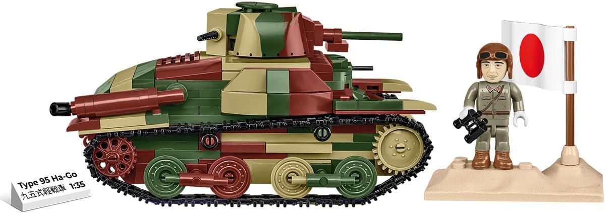 For the first time in the Historical Collection from COBI, the long-awaited Japanese vehicle! The Type 95 Ha-Go was a light tank used during World War II. Designed in the 1930s, it was the main light tank of the Imperial Japanese Army. The Type 95 Ha-Go participated in many important battles, including combat in the Philippines, Burma and Guadalcanal. The block model was designed in a scale of 1:35 and consists of 380 elements. The set includes a figure of a Japanese tank driver and a bilingual nameplate. The wheels, tracks and turret are movable. The whole set is complemented by a block with a fragment of terrain and the Japanese flag! There are high-quality prints on the tank and the figure!