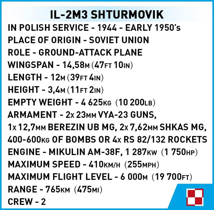 The IL-M3 aircraft was designed from COBI construction blocks in the scale of 1:32 using all-new elements. One of the few original planes is on outdoor exhibition at the Polish Army Museum in Warsaw. It was used as a model for this set. The block model offers many movable elements such as a rotating propeller, movable wing ailerons and wheels with rubber tires that can be folded to a horizontal position. Details and post-war colors of the aircraft and armament (including rockets) have been reproduced. Attention is drawn to the blue bottom with chessboard markings. The cockpit canopy has been redesigned and can be opened to seat the pilot and gunner figures in the seats. Thanks to a special display stand with a plate containing the name of the plane and a place to attach the figures, the whole set looks fantastic! The figures were developed based on uniforms in the collection of the Polish Army Museum. A very attractive addition is a historical map showing the borders and name of Poland before the unfavorable territorial exchange with the USSR, which took place on February 15, 1951. The model uses durable prints and historical markings. The set completes the collection of iconic planes released in 1:32 scale, intended for enthusiasts of history, military technology and fans of the highest quality block modeling!