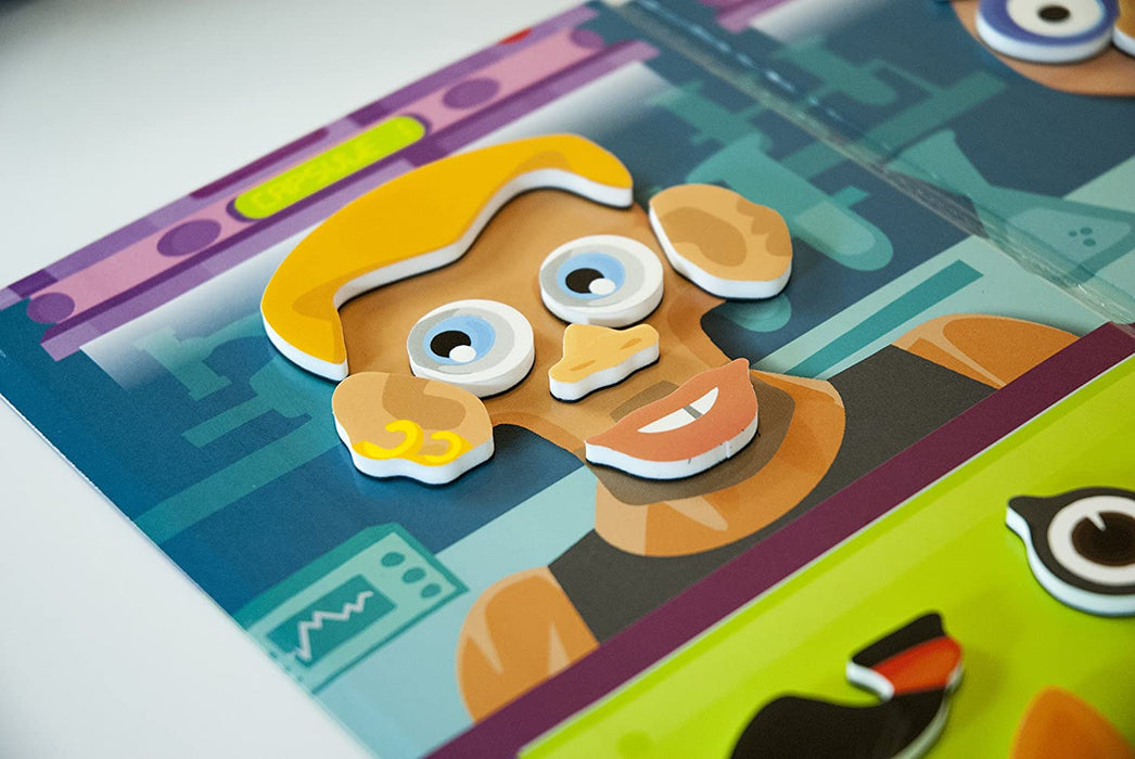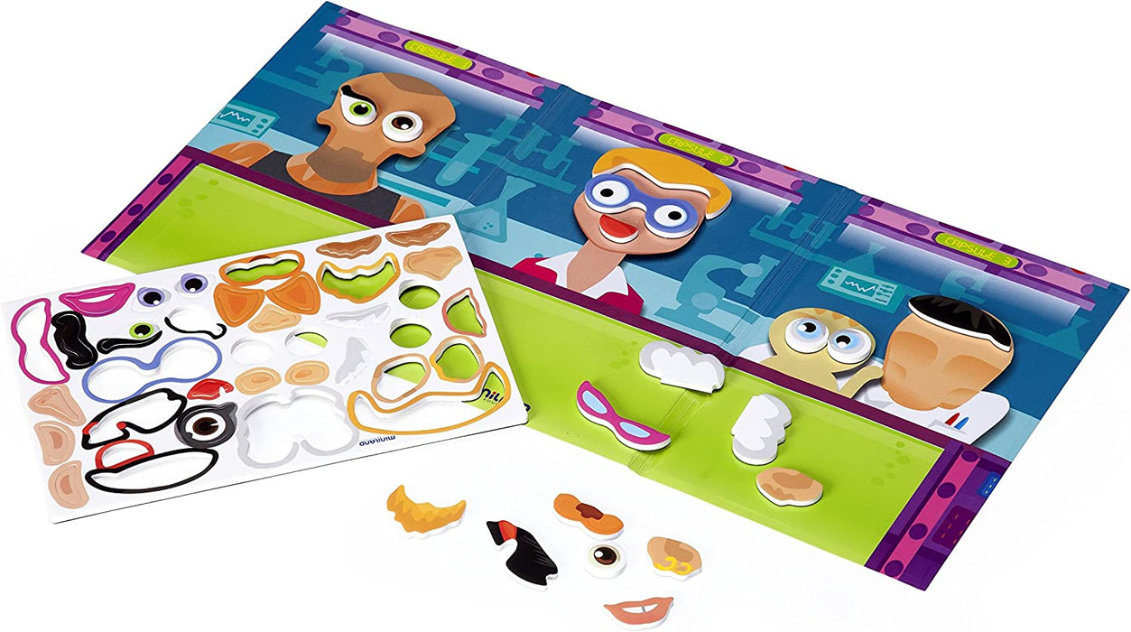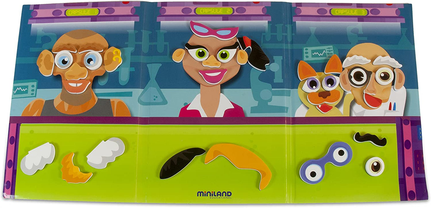 Miniland on the go crazy faces contains 1 magnetic surface, 38 magnetic pieces. Take out all the pieces and mix them on the inner board. Look at the characters on the outer board. Use your memory to combine the pieces on the faces in the four frames, and then check that they are all the same as the models on the outer board. You can also combine the pieces as you like to create endless crazy characters. It measures 21.5 cm length by 44 cm width.